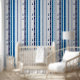 White color design with vertical lines in blue tones and abstract brocade.