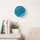 This beautiful round clock with white numerals features an abstract swirly design in trendy teal shades.