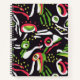 This artistic pattern is inspired in tribal art with a modern twist of a vibrant colour palette over dark background. The pattern feels dynamic and unique with its eye shaped drawings and colourful doodles