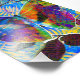 An abstract blue, orange, green, and purple butterfly against a lime green and blue botanical background, framed by dark maroon leaves.