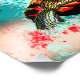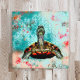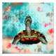 A hand drawn depiction of a turtle with an abstract background. Colours used: red, blue, teal, green, yellow, purple.