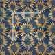 Yellow batik style design of sunflowers on a rich deep blue background.