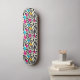 This vibrant skateboard features a dynamic fusion of bold black and white zebra-like stripes overlaid with colourful paint splashes in the shapes of autumn leaves. The striking contrast between the monochrome background and the vivid hues of red, orange, and yellow creates a visually captivating pattern. Ideal for various creative applications, this design brings together the wild essence of animal prints with the warm tones of fall foliage.