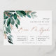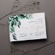 Elegant b'nai mitzvah invitation features watercolor eucalyptus leaves and green foliage cascading from the upper left corner, embellished with rose gold foil accents. Personalise with your temple ceremony and celebration details aligned at the right. Cards reverse to solid forest green.