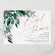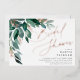 Elegant bridal shower invitation features watercolor eucalyptus leaves and green foliage cascading from the upper left corner, embellished with rose gold foil accents. Personalise with your bridal shower details aligned at the right. Cards reverse to solid forest green.