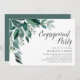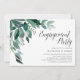 Elegant botanical engagement party invitations feature watercolor eucalyptus leaves and green foliage cascading from the upper left corner. Customise with your engagement celebration details aligned at the right and embellished with chic calligraphy script. Invitations reverse to solid forest green.