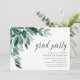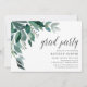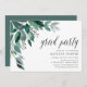 Elegant botanical invitations for chic graduation celebrations feature watercolor eucalyptus leaves and green foliage cascading from the upper left corner. Customise with your graduation party details aligned at the right and embellished with chic calligraphy script. Invitations reverse to solid forest green.