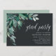 Elegant botanical invitations for chic graduation celebrations feature watercolor eucalyptus leaves and green foliage cascading from the upper left corner, on a rich off-black background. Customise with your graduation party details aligned at the right and embellished with chic calligraphy script. Invitations reverse to solid moss green.