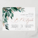 Elegant gender neutral b mitzvah invitation features watercolor eucalyptus leaves and green foliage cascading from the upper left corner, embellished with rose gold foil accents. Personalise with your temple ceremony and celebration details aligned at the right. Cards reverse to solid forest green.
