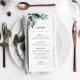 Our chic botanical wedding or special event menu features your starter courses, entrees and desserts accented with a spray of watercolor green foliage and eucalyptus leaves. "Menu" appears at the top in elegant calligraphy lettering. Coordinates with our Abundant Foliage wedding and event collection.