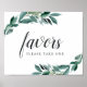 Designed to match our Abundant Foliage wedding collection, this elegant botanical sign invites guests to take a favour. Personalise with two lines of custom text in calligraphy and block lettering (shown with "Favours; please take one"), framed by lush watercolor greenery and eucalyptus leaves.