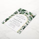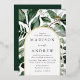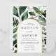 Elegant wedding invitations featuring your wedding details nestled inside of an arched gold foil frame surrounded by eucalyptus, ferns, and other rich greenery. The botanical arch wedding invitations reverse to a solid dark green background. Designed to coordinate with our Abundant Greenery wedding collection.