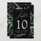Elegant, botanical wedding table cards featuring the table number, your names, and wedding date nestled in a rectangular frame surrounded by eucalyptus, ferns, and other rich greenery with a black background. Personalise the number for each table card and add it to your cart. The 5x7 table cards were designed to coordinate with our Abundant Greenery wedding collection.