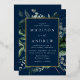 Elegant wedding invitations featuring your wedding details nestled inside of a rectangular gold foil frame surrounded by eucalyptus, ferns, and other rich greenery with a navy blue background. The modern botanical wedding invitations reverse to a solid navy background. Designed to coordinate with our Abundant Greenery wedding collection.