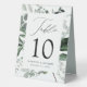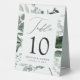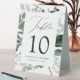 Elegant botanical wedding table card tent sign featuring the table number, your names, and wedding date nestled in a rectangular frame surrounded by eucalyptus, ferns, and other rich greenery. This nature-inspired design adds a touch of refined elegance to your wedding decor. Personalise the number for each table card and add it to your cart to create a cohesive and sophisticated atmosphere at your reception. Perfect for garden, rustic, or botanical-themed weddings.