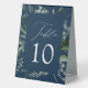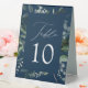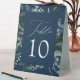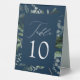 Elegant, botanical wedding table card tent signs featuring the table number nestled in a rectangular frame surrounded by eucalyptus, ferns, and other rich greenery with a navy background. Personalise the number for each table card and add it to your cart. Designed to coordinate with our Abundant Greenery wedding collection.