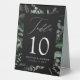 Elegant, botanical wedding table card tent sign featuring the table number, your names, and wedding date nestled in a rectangular frame surrounded by eucalyptus, ferns, and other rich greenery with a black background. Personalise the number for each table card and add it to your cart. Designed to coordinate with our Abundant Greenery wedding collection.
