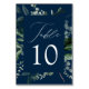 Elegant, botanical wedding table cards featuring the table number nestled in a rectangular frame surrounded by eucalyptus, ferns, and other rich greenery with a navy background. Personalise the number for each table card and add it to your cart. Designed to coordinate with our Abundant Greenery wedding collection.