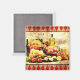 Digital art design features an abundance of fresh food and Italian / Mediterranean cooking ingredients on a distressed red harlequin background.