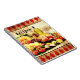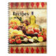 Digital art design features an abundance of fresh food and Italian / Mediterranean cooking ingredients on a distressed red harlequin background.