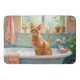 A curious Abyssinian cat enjoying a bubbly bath in a bright and colourful bathroom setting. This sleek and playful design adds charm and personality to any bathroom space.