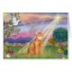 Against a background of beautiful foliage and a multi coloured sky, a red Abyssinian cat sits in the light of a day star.