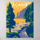 Acadia vector artwork design. Acadia National Park is primarily on Maine's Mount Desert Island. Its landscape is marked by woodland, rocky beaches and glacier-scoured granite peaks such as Cadillac Mountain.