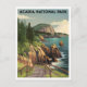 A picturesque and nostalgic depiction of Acadia National Park, celebrated for its rugged coastline, granite peaks, and lush forests. The design captures iconic sights such as Cadillac Mountain, the rocky shores along the Atlantic Ocean, and vibrant fall foliage, showcasing the park’s diverse landscapes. Rendered in a vintage style, the artwork evokes the natural beauty and serene atmosphere of Acadia National Park, inviting viewers to explore its scenic trails, rich wildlife, and breathtaking ocean views.