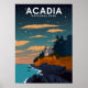 Acadia Travel Poster. This National Park is a 47,000-acre Atlantic coast recreation area primarily on Maine's Mount Desert Island. Its landscape is marked by woodland, rocky beaches and glacier-scoured granite peaks such as Cadillac Mountain.