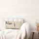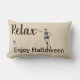 This accent throw pillow is shown with in a neutral colour of taupe and beiges the front of this pillow has two skeletons on it, one standing and one sitting. Text reads "Relax, Enjoy Halloween".. Backside is beige and taupe with borders and happy Halloween written in black in a fun script.