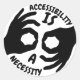 A round white sticker with a black round all-caps font and international symbol for sign language interpretation large and in the center. The text is round with the shape of the sticker. It reads, "ACCESSIBILITY IS A NECESSITY"
