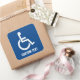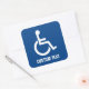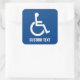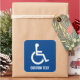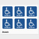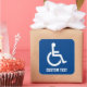 Accessibility sign. Wheelchair symbol. Stylised white person on a wheelchair. Blue background. Custom text.