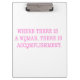 In pink text it reads: "Where there is a Woman, there is Accomplishment." The O's in the quote are actually the sign for Female.