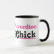This white mug with a stylish black handle and interior features the phrase "Accordion Chick" in a fun, bold font with magenta accents. It’s designed for female accordion enthusiasts who want to start their day on a high note or enjoy a cosy beverage break. The mug is a great gift for musicians, music teachers, or anyone who loves the unique sound of the accordion.