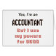 Yes, I'm an Accountant but I Use My Powers for Good funny office humour saying in dot matrix text in black and red.