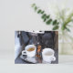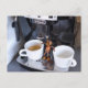 Acorn elf is drinking coffee from coffee machine postcard