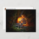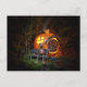 An acorn elf is sitting in front of a pumpkin house – funny autumn Halloween postcrossing postcard