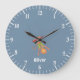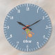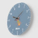 Cute blue wall clock for kids featuring a cartoon monkey hanging upside down on a trapeze . Personalize it with a name .