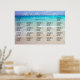 Wedding seating chart poster with a tropical image of a turquoise ocean stretching to the horizon, and waves upon the sand. "Mr. and Mrs." with married last name, can be printed along the top, with first names of the newlyweds beneath. Also include the wedding date. Use the 22 separate text lists to show guests to their tables alphabetically. Simply delete any sections you won't need.