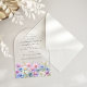 Elegant watercolor asters create a floral border at the bottom of this arch-shaped acrylic birthday invitation. The soft pastel purple, pink blue and white flowers are the September birthday month flower making this the perfect theme for your September birthday.