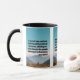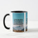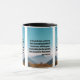 This two-tone mug features a cooper hewitt print font with black letters displaying the "Acts 10:2 KJV" bible scripture verse over a background picture showcasing a mountain range in the far distance with snow and this dual colour theme under a clear blue sky. This verse is referencing the Book Of Acts 10th chapter showing the 2nd verse in this bible scripture quote theme from the King James bible. The rim & handle are glazed in matching colours available in 11-ounce or 15-ounce sizes microwave and dishwasher safe ceramic construction.