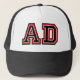 "AD" trucker hat with red and black letters