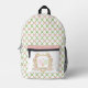 This pickleball backpack has front pocket design with a watercolor image of a crest surrounded by floral branches with green and pink gingham pickleball paddles in the centre. The main backpack design has a green trellis pattern with pink bows around the edge with the same pattern on the sides. Colours used include moss green, blush pink and and tan. You can personalise with a name.
