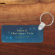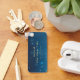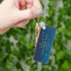 Blue keychain featuring stars on the front with custom gold text. The back has your business name, logo, and a QR code for your business website. Great for business events, holiday parties, and more. Use the template to create your own custom QR code keychain.