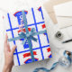 The red and blue sports t-shirt on this wrapping paper has a large white number 9, and space for you to personalise it by adding the birthday child's name. The design also features a bold 'Happy Birthday' banner. Matching birthday cards are also available.