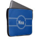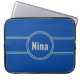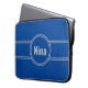 You can add a name or other text to the centre of the sleeve. Two grey circles surround the text. The laptop sleeve is deep blue. The text is grey.