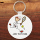 A customisable tennis keychain featuring a male stick figure tennis player with a racquet and tennis ball and a place to add your name or other text!