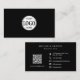 This modern minimalist professional black business card features a logo template on the front for you to add your own company logo, with QR code and contact information on the back, including social media icons.