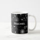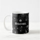 A black & white, geometric flower pattern on a mug. Use "Personalize this template" to change the "Rachel" text and name and create a unique, customized gift. A stylish mug featuring my original geometric floral pattern, with a selection of flowers including: Japanese anemones, daffodils, violets, pansies, daisies, roses, Michaelmas daisies, cinquefoils, primroses, buddleia, clematis, gardenia, phlox and forget-me-nots. The print is white with a subtle dark grey behind on a black background.