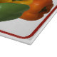 This cutting board is great. High quality tempered glass, and includes small rubber feet which you apply. The glass has a beautiful textured look to it, which gives it great character but still allows the beautiful print and artwork to shine through! All colors are vibrant and the artwork and text are exactly as I hoped!